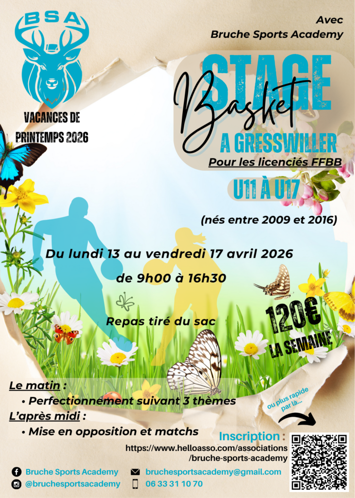 Les inscriptions sur HelloAsso sont déjà ouvertes ! C’est ici : https://www.helloasso.com/associations/bruche-sports-academy/adhesions/stage-basket-a-gresswiller-printemps-2026
